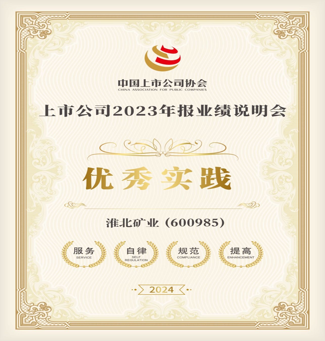 此次荣获“2023年报业绩说明会优秀实践”奖,充分体现了市场对淮北矿业在投资者关系管理领域规范运作、创新发展的肯定与认可。未来,淮北矿业将深入贯彻“新国九条”,积极践行“崇德广业 聚能精进”的企业核心价值观,坚持投资者为本,持续提升投资者关系管理水平,以高水平投关管理赋能公司高质量发展。